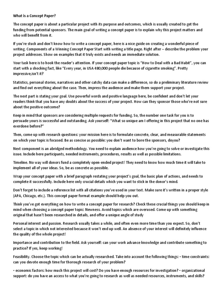The type size should be large enough to read easily, and margins should be. Best topics for a concept paper if you want to know some concept paper ideas that you can deal understanding laissez faire 20. This helps the funder save time by eliminating ideas that are not likely to be funded and may also serve as a platform for further discussion with the …. This concept paper represents you! Funders that request concept papers often provide a template or format.